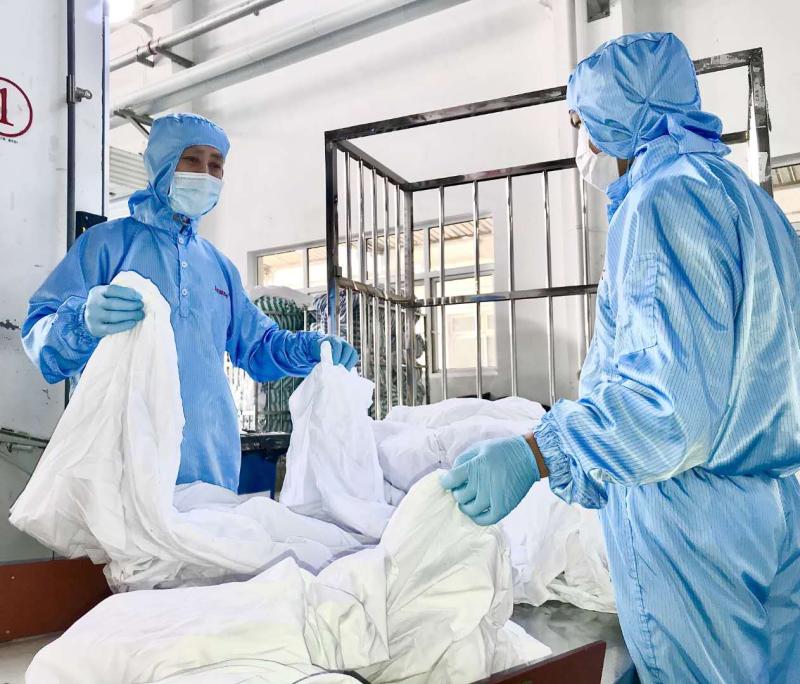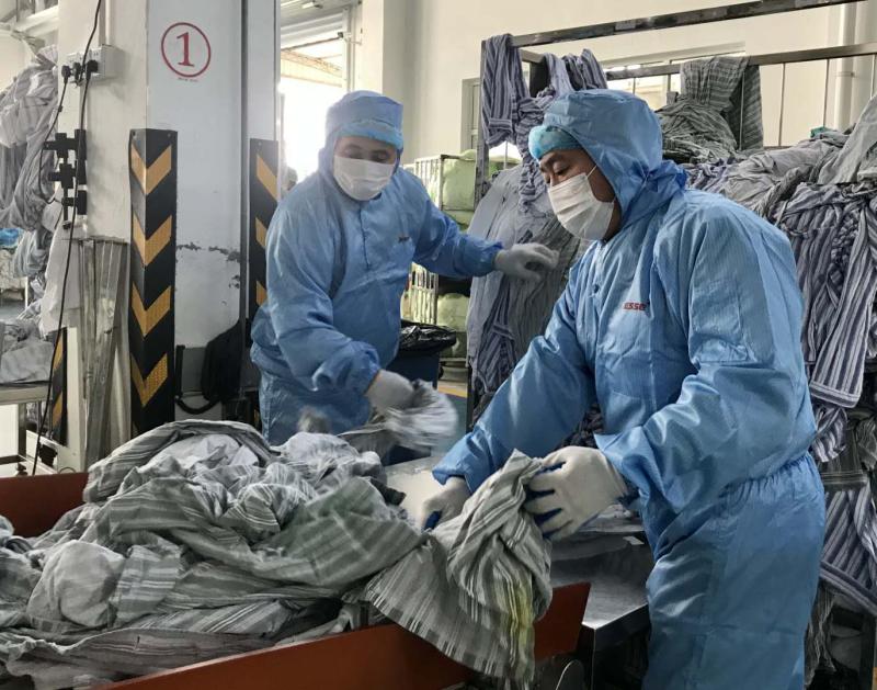 據(jù)他介紹,一方面,一般普通的臟污織物所經(jīng)歷的消毒包含洗滌過程中的化學(xué)消毒和濕熱消毒,以及干燥過程中的干熱消毒,通過利用隔離式洗衣機洗滌,幾輪化學(xué)加物理消毒下來,可以保障織物的清潔衛(wèi)生程度。對于重度污染的織物,甚至是感染性織物,消毒方式就更加嚴(yán)格了,無論從消毒劑的用量上,還是洗滌烘干的溫度上,都作了嚴(yán)的把控,以確保消毒質(zhì)量。